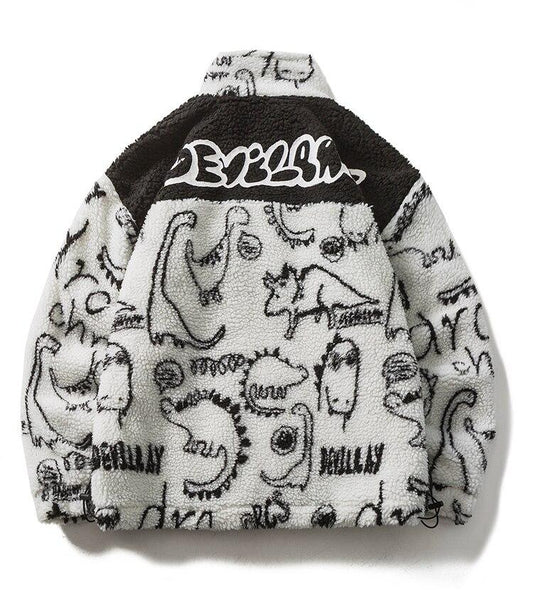 Lambswool Parkas Winter Jacket Men Dinosaur Graffiti Fuzzy Casual