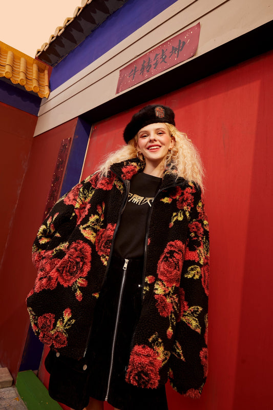 Rose Jacquard Zipper Oversize Women Teddy Jacket,Spring Vintage Full