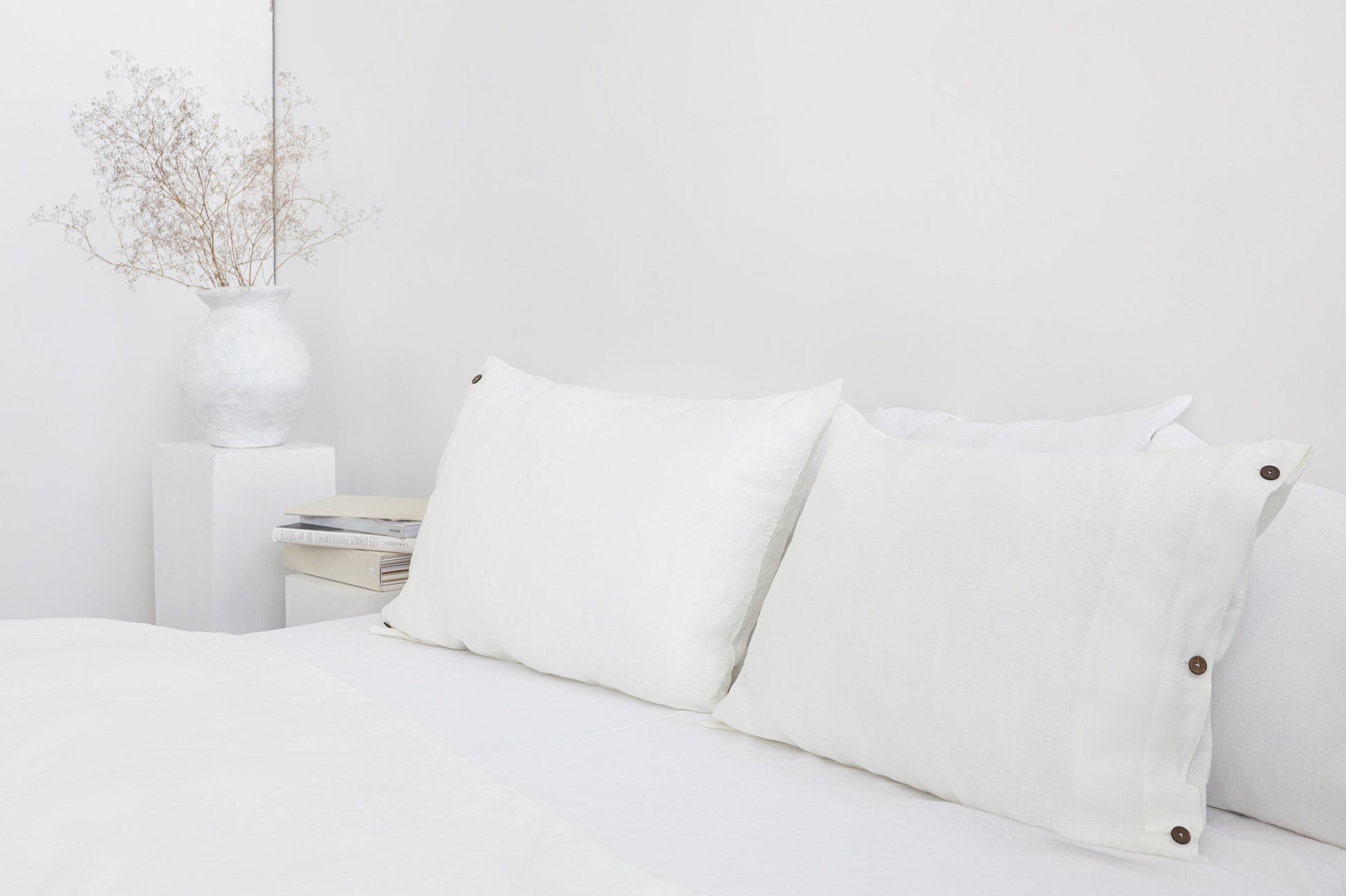 White linen pillowcase with coconut buttons